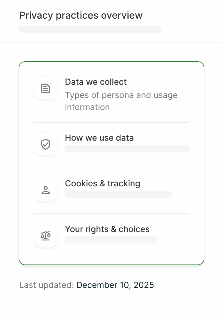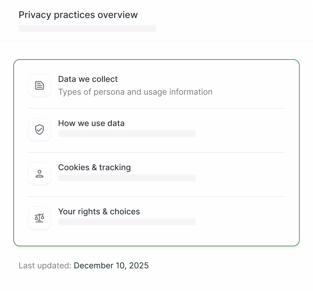 - Legitimate Interest. We process the following categories of Personal Data when we believe it furthers the legitimate interest of us or third parties: profile or contact data, payment data, device or web data, demographic data, professional or employment-related data, sensory data, categories of data considered “Sensitive” under applicable privacy laws, inferences drawn from other Personal Data collected, and other identifying information that you voluntarily choose to provide. We may also de-identify or anonymize Personal Data to further our legitimate interests. Examples of these legitimate interests include (as described in more detail above) providing, customizing and improving the Services, marketing the Services, corresponding with you, meeting legal requirements and enforcing legal terms, and completing corporate transactions.