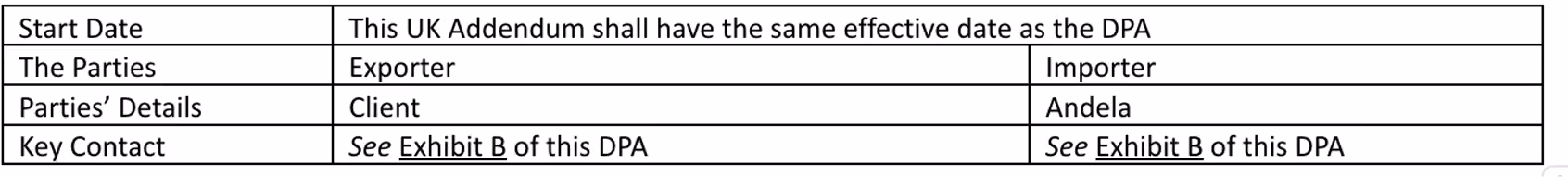 Table contents:Data Subjects: As described in Exhibit A of the DPACategories of Personal Data: As described in Exhibit A of the DPASpecial Category Personal Data (if applicable): As described in Exhibit A of the DPANature of the Processing: As described in Exhibit A of the DPAPurposes of Processing: As described in Exhibit A of the DPADuration of Processing and Retention (or the criteria to determine such period): As described in Exhibit A of the DPAFrequency of the transfer: As necessary to provide perform all obligations and rights with respect to Personal Data as provided in the Agreement or DPARecipients of Personal Data Transferred to the Data Importer: Andela will maintain and provide a list of its Authorized Subprocessors upon request. - Competent Supervisory AuthorityThe supervisory authority shall be the supervisory authority of the Data Exporter, as determined in accordance with Clause 13 of the EU SCCs. The supervisory authority for the purposes of the UK Addendum shall be the UK Information Commissioner’s Officer.